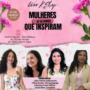 Com a proposta de valorizar histórias de superação, fortalecer o empreendedorismo e incentivar o desenvolvimento pessoal e profissional, o Workshop Mulheres que Inspiram será realizado no dia 7 de março, a partir das 8h, no Centro Aguiar, localizado na Avenida Aciolly Nunes, nº 2060, bairro Piqui, em São Mateus.